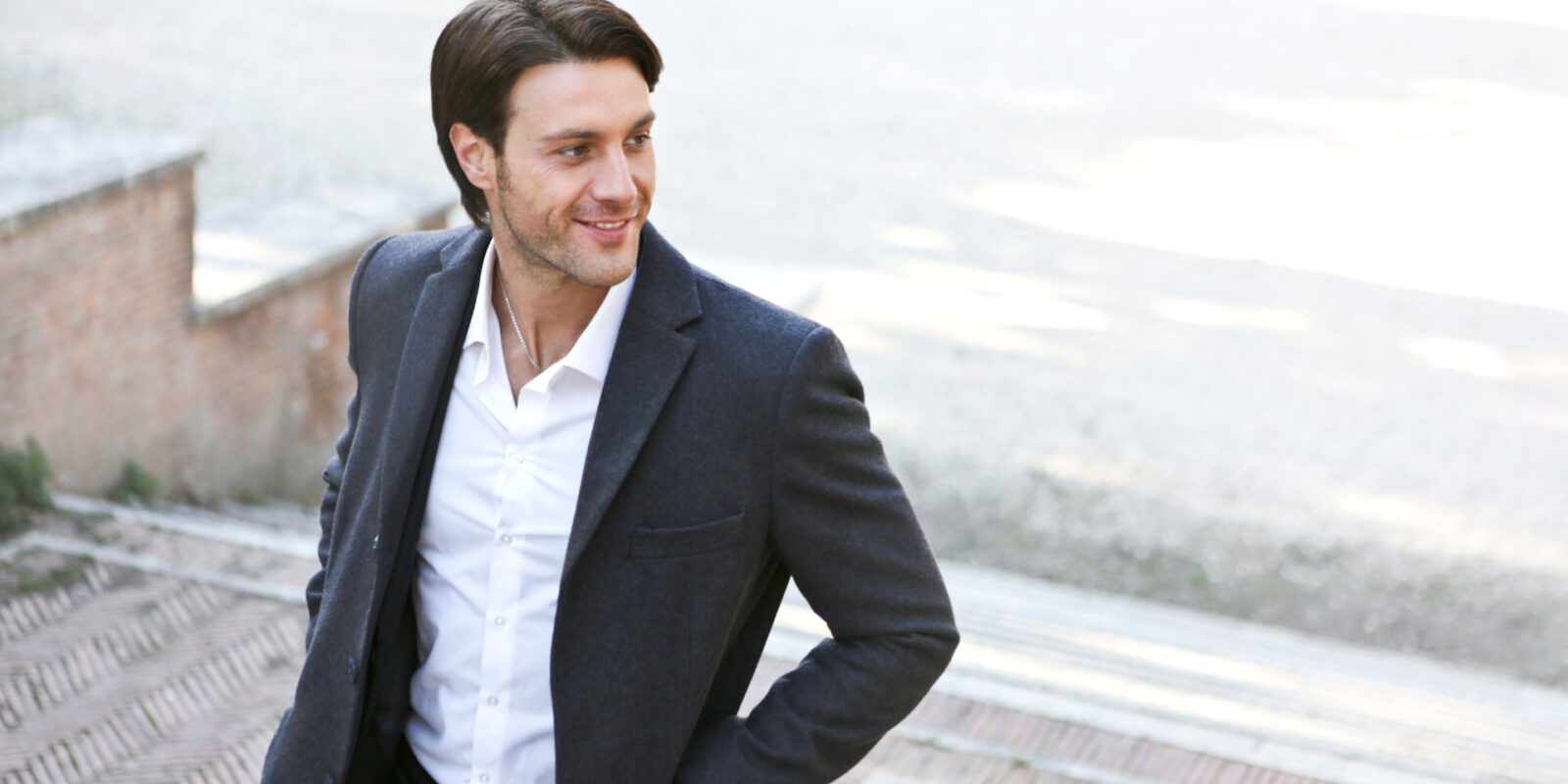 Das Sakko sollte immer geschlossen getragen werden, wenn du stehst. Das Hemd sollte hochwertig sein und gut sitzen.